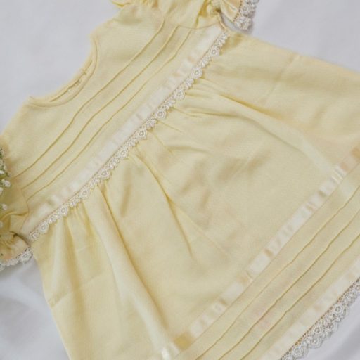 Delicate, charming, and brimming with innocence, these baby frocks in white and lemon self-woven cotton are crafted to wrap your little one in comfort and grace. Designed with fine pintucks, lace, and ribbon, every frock exudes timeless elegance and a tender, heartwarming charm.