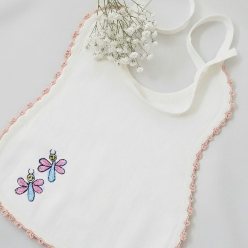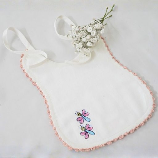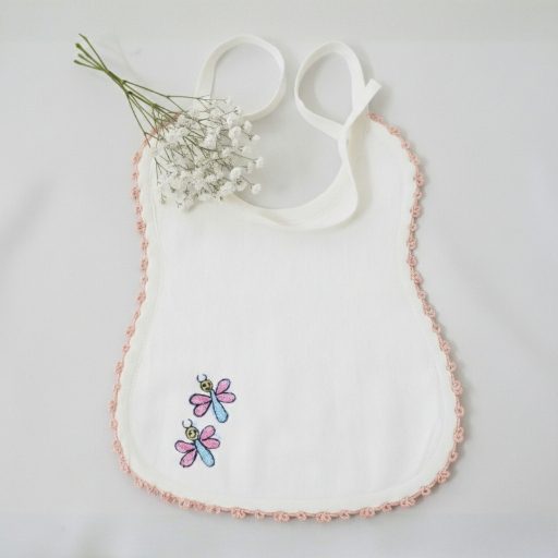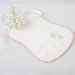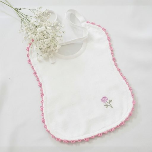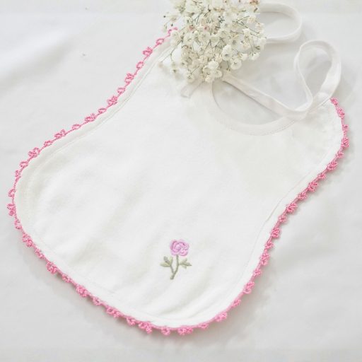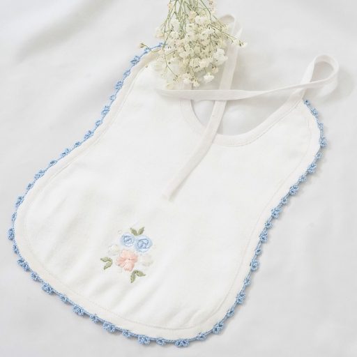 The base in pure white flannel is edged with hand-done crochet in gentle pastel hues: blush pink, peach glow, powder blue, lemon yellow and garden green. Each stitch adds to its timeless charm, turning these bibs into heirloom-worthy creations that mothers would delight in keeping as treasures.