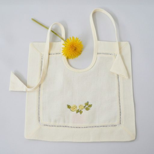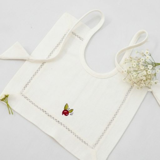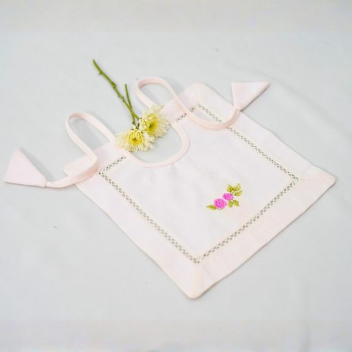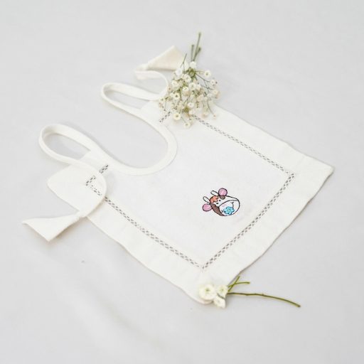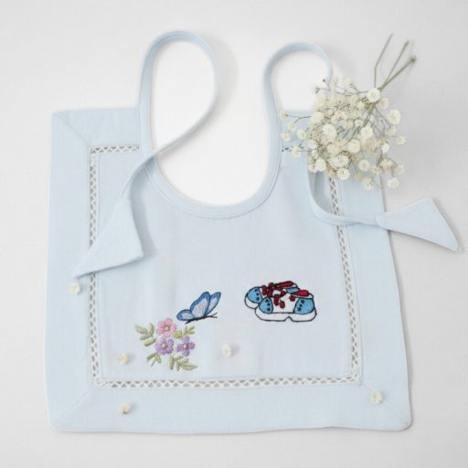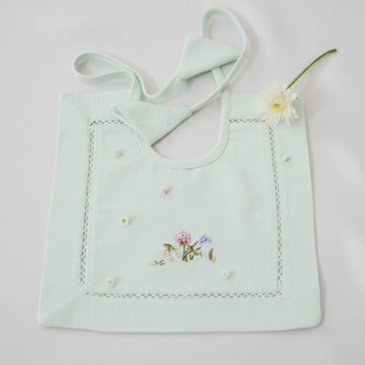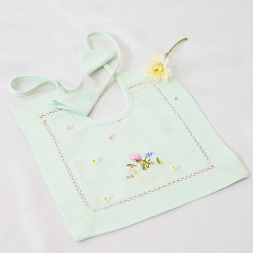 The flannel base comes in soft pastel hues: blush pink, powder blue, lemon yellow, garden green and pure white. Each shade adorned with its connecting lace and fine embroidery, turns the bib into not just a daily essential, but a timeless keepsakeβa treasure in itself.